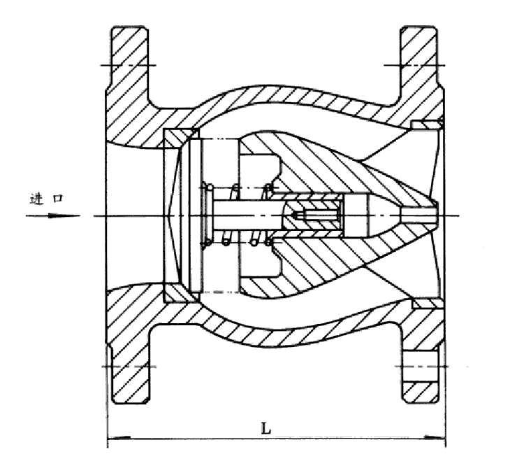 該閥由閥體、閥座、導流體、閥瓣.軸瓦及彈簧等零件組成。內部流道采用流線型設計,壓力損失