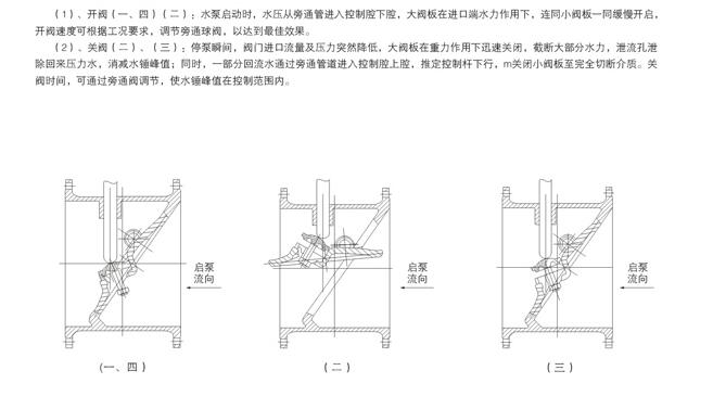 當(dāng)水泵啟動(dòng)后進(jìn)口端水經(jīng)過(guò)、過(guò)渡器、截止閥、高壓管、進(jìn)入膜片缸下部,在水的壓力下推動(dòng)膜片關(guān)上行帶小閥板緩慢開(kāi)啟,大閥板在水力的推動(dòng)下與小閥板同時(shí)開(kāi)啟,完成開(kāi)閥。